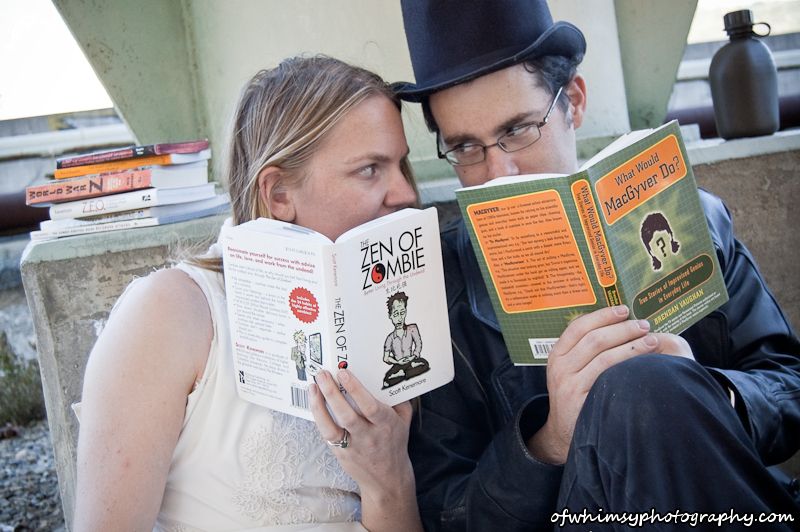 A young lady who attended Kenyon College a few years after me has done a post-apocalyptic photo shoot with her husband-to-be to celebrate their upcoming wedding. My humble tomes have found their way into several of the pictures.
