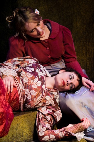 An aside: The professional reviewers of this play all seem reasonably sure that Carmilla is a work about “lesbian vampires” or even “steamy lesbian vampires.”  I emerged less certain.  It is definitely a play where women kiss one another passionately, yes.  But the instigating kisser (Carmilla) does so as part of a larger plan to turn her victim into a vampyre.  The kissee (Laura) gives no indication of seeking anything beyond friendship with Carmilla, and must be coaxed along every step of the way.  There is no Aha!-moment when Laura says, “You have seduced me!  I am won over!  Now let’s be lesbian partners/have sex/etc.”  But perhaps I am somehow missing the point.  Perhaps it is “masculinist” of me to invoke a binary by which something is either lesbian or not-lesbian.  (The many same-sex couples in attendance on the night I went to see Carmilla may have already consecrated the work as “lesbian” and it is probably beyond my poor power– or provenance– to challenge this.)