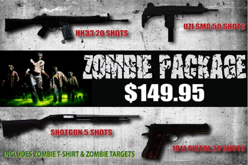 You know those shooting ranges in Las Vegas that advertise at the airport? The ones where you can shoot old-timey guns, or enormous guns, or any kind of guns you want without a license, as like a touristy thing to do? One of these places– called The Gun Store– is now offering a” zombie package” where you get to shoot four kinds of guns at zombie-themed targets. What is not to love?