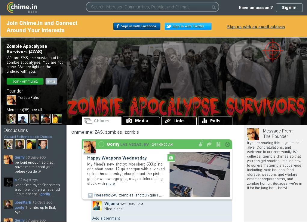A new social network site called Chime.In has a special community, Gorify, designed exclusively for zombie fans. It appears to post zombie stories and links, and to be curated by actual living humans. Click here to take a look.
