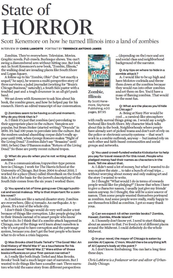 Over the weekend, Printer’s Row— the literary magazine of The Chicago Tribune-– ran a nice photo and interview with me about Zombie, Illinois.
